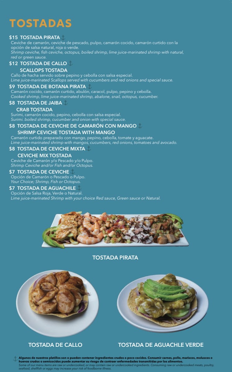 Fritos de camaron, carne asada, pescado o pulpo con queso, lechuga, tomate, aguacate Fried shrimp, steak, fish or octopus with cheese, lettuce, tomatoes, onions and avocado.
